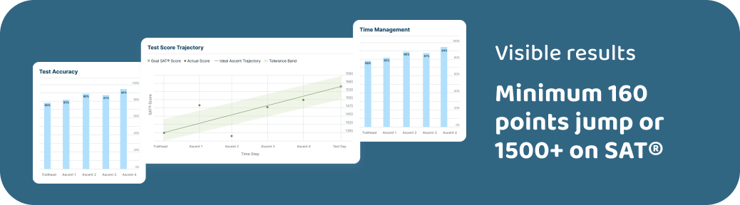Your SAT® GPS - clear, precise, always on. After each Ascent Module, Sherpal’s Readiness Dashboard reveals your current strengths, growth areas, and score trajectory, so your next move is obvious and progress is visible every session. Detailed test score reports spotlight exactly what to tackle next, eliminating guesswork and keeping you focused on your goal.